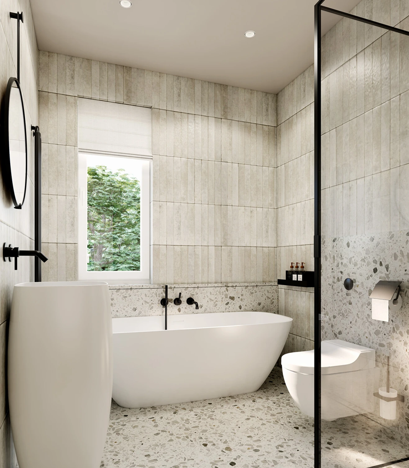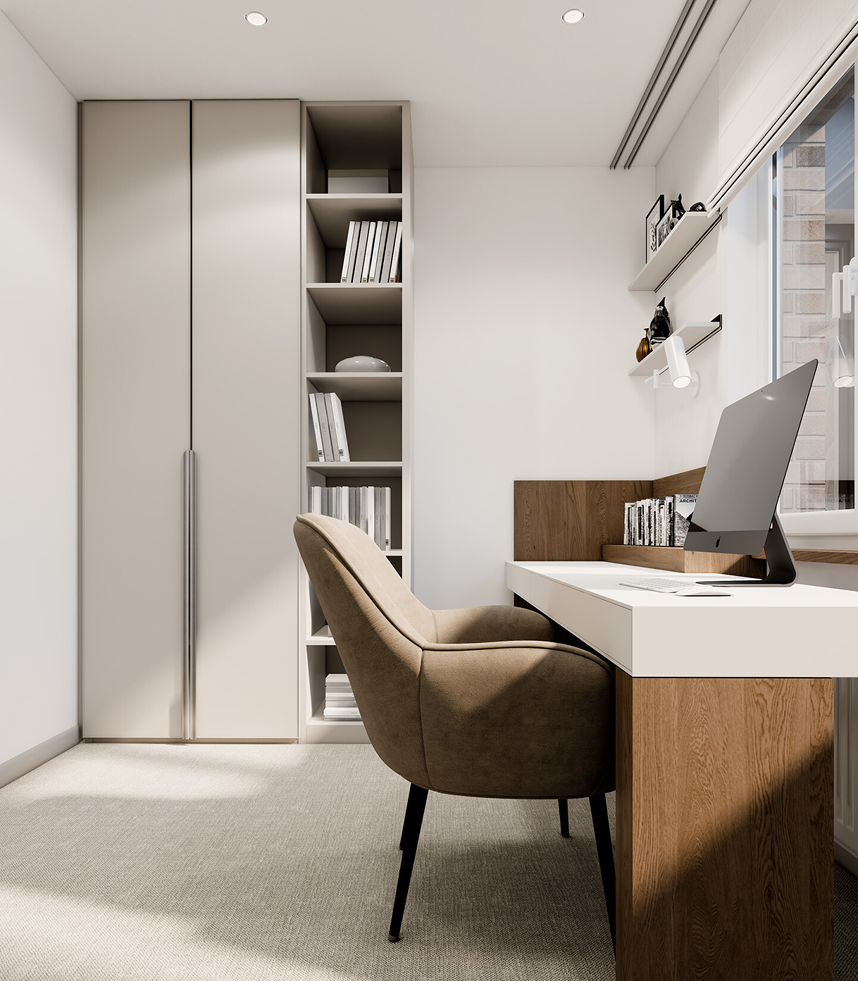 Na piętrze każdego domu znajduje się osobny gabinet z dużym oknem, oddzielony od części dziennej. To idealne miejsce do pracy, nauki lub spokojnego odpoczynku. Naturalne światło sprzyja koncentracji, a poczucie odrębności pozwala zachować równowagę między obowiązkami a domowym rytmem dnia. To rozwiązanie, które doceni każdy, kto potrzebuje przestrzeni, by w ciszy i skupieniu zająć się swoimi sprawami.